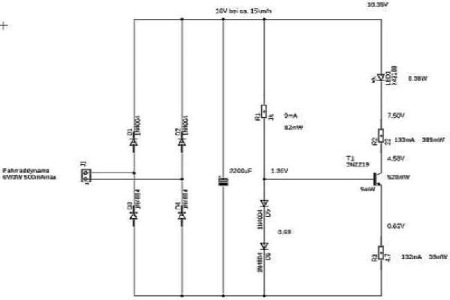 Schaltplan Die vom Dynamo gelieferte Wechselspannung wird über Brückengleichrichtung in Gleichspannung gewandelt, die durch einen Elektrolytkondensator noch geglättet wird (gibt noch helleres Licht). Die nachfolgende Schaltung aus Widerständen, Dioden und einem Transistor (eine einfache Stromquelle) sorgt bei der vom Dynamo gelieferten geschwindigkeitsabhängigen Spannung für einen einigermaßen konstanten Strom durch die LED.