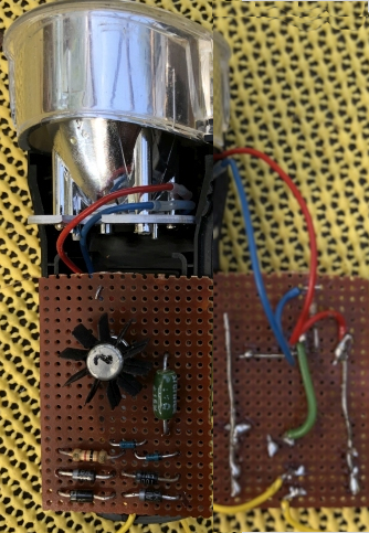 Die Originalplatine der LED-Leuchte wird durch eine Lochrasterplatine ersetzt, auf der die neue Bauteile befestigt und verdrahtet sind.